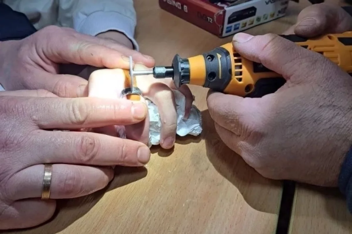 Прибывшие спасатели осмотрели палец подростка и оценили ситуацию. Чтобы не травмировать кожу, между пальцем и кольцом они аккуратно проложили защитный материал. После этого с помощью слесарного инструмента металлическое изделие было аккуратно распилено и снято.