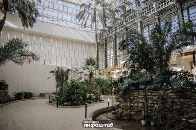 Основные инженерные коммуникации смонтированы практически полностью. В завершающей стадии находится отделка зимнего сада и кинозала «Модерн». Сейчас на объекте работают более 60 человек. По контракту подрядчик должен завершить реконструкцию до декабря.