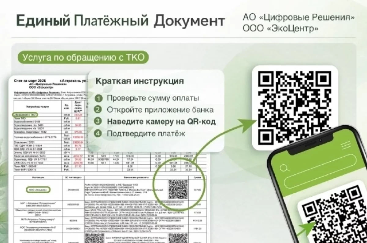 Жители Астрахани начнут получать квитанции за вывоз твёрдых коммунальных отходов в составе единого платёжного документа. Региональный оператор ООО ЭкоЦентр перешёл на новую систему расчётов совместно с акционерным обществом Цифровые решения.